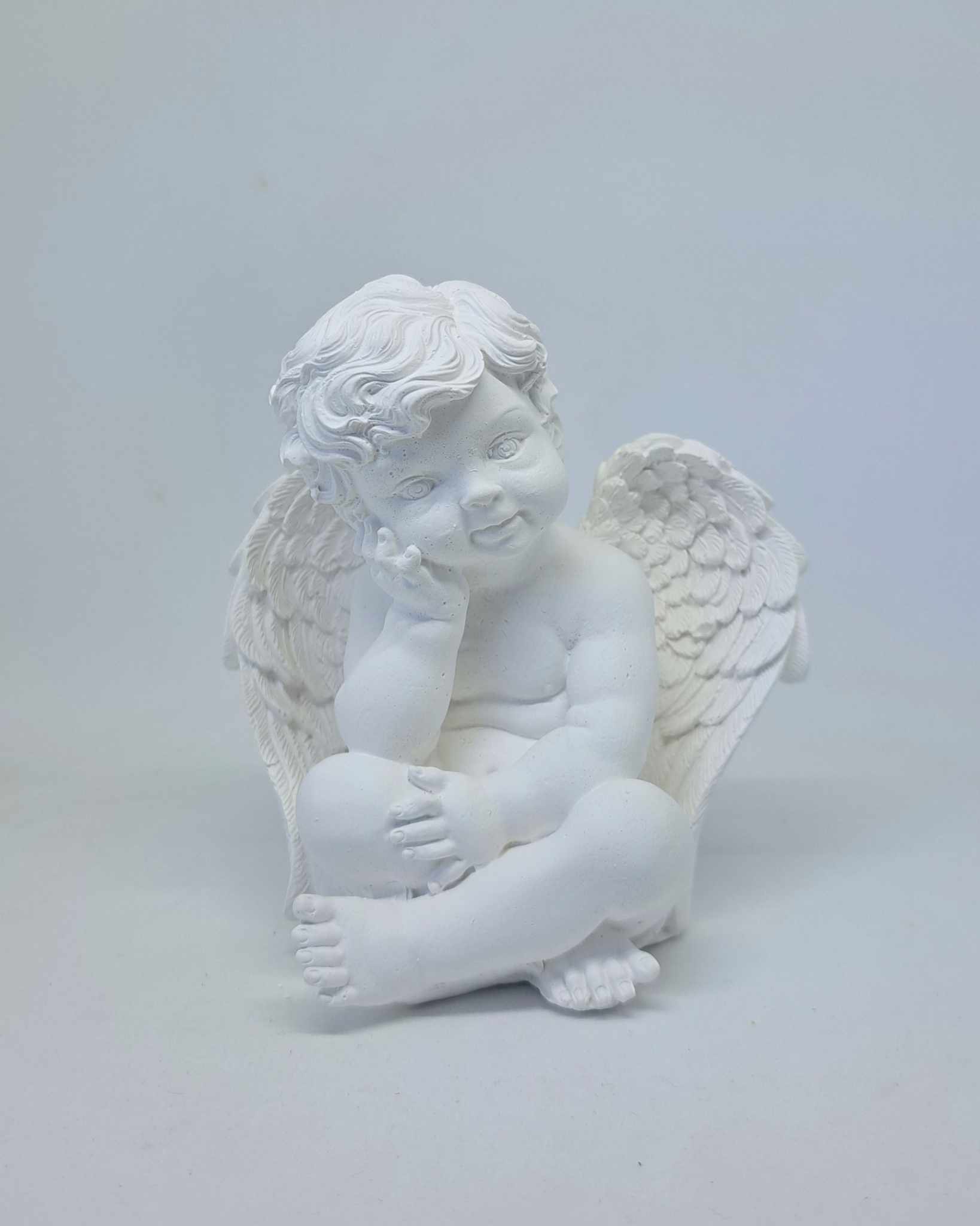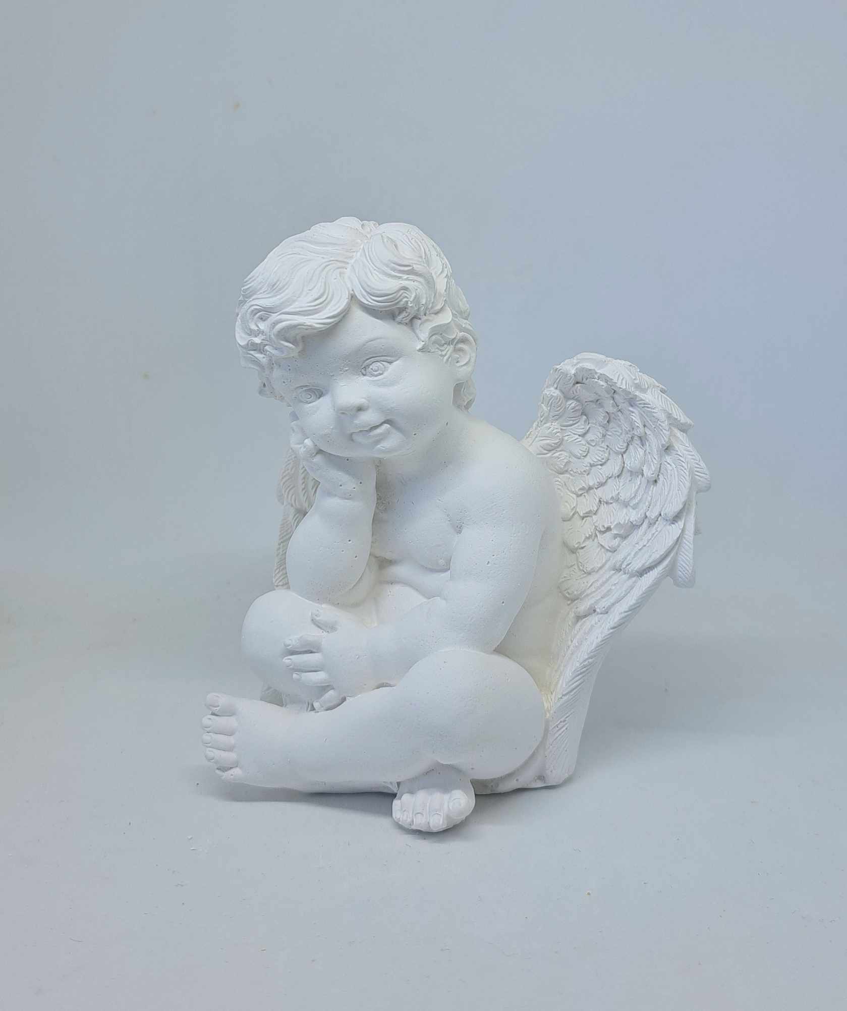 Zamyślony, siedzący Aniołek to nowość w moim sklepie. Zadumany może czeka na kogoś… może tęskni…może czuwa… Idealny jako drobny upominek na każdą okazję; komunię, chrzest czy też na grób ( po wcześniejszym zaimpregnowaniu ).